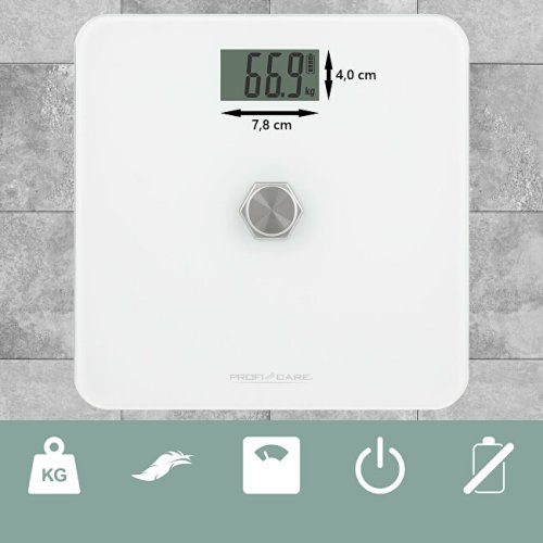 Kinetická osobná váha ProfiCare® ponúka presné merania bez použitia batérií tým, že generuje vlastnú energiu krátkym stlačením tlačidla napájania. Táto bezbatériová osobná váha je vďaka svojej samogenerujúcej energii šetrná a udržateľná k životnému prostrediu. Extra veľký, kvalitný sklenený povrch (cca 31 x 31 cm) je nielen elegantný, ale aj odolný proti poškriabaniu a ľahko sa čistí a zaisťuje dlhú životnosť vašej váhy. Extra veľký LCD displej zaisťuje optimálnu čitateľnosť. Môžete si vybrať medzi jednotkami merania kg alebo lb a využiť rozsah merania 5–180 kg v krokoch po 100 g. Automatické vypnutie, indikátory nízkej energie a preťaženia a protišmykové nožičky zaisťujú bezpečné a jednoduché použitie váhy. Rozsah merania je 5-180 kg, kedy meria po 100 g. Jej povrch (hygienický, odolný proti škrabancom) vyžaduje len minimálnu starostlivosť a stačí ju raz za čas utrieť od prachu. Rozmery plochy: cca 31 x 31 cm. Jej spodná časť je vybavená protišmykovými nožičkami, čím je zabránené nežiaducemu pohybu po podlahe. Automatické vypnutie po meraní šetrí energiu.