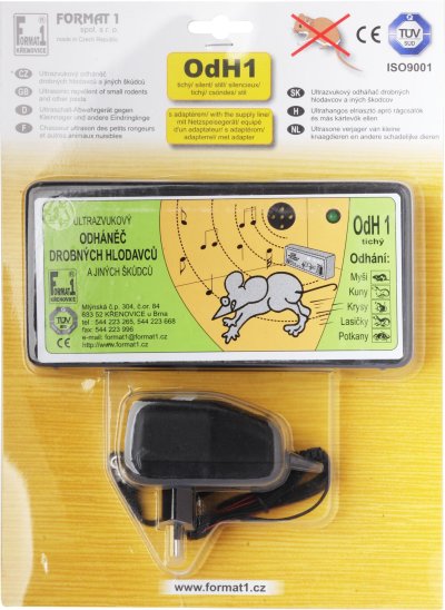 Ultrazvukový tichý odháňač myší, kún, potkanov, lasičiek a potkanov s adaptérom. Vydáva prelaďované, nepravidelne dlhé ultrazvukové vlny s nepravidelne dlhými prestávkami. Napriek tomu, že hlasitosť je stála, sú ľuďmi nepočuteľné, alebo iba veľmi slabo počuteľné. Ideálne napr. do kancelárií, pivníc, malých skladov, garáží, všade tam, kde sa pohybujú ľudia. Prístroj je schválený podľa platných predpisov a noriem v SR. Neškodí ľuďom ani domácim zvieratám (mačkám, psom, králikom, sliepkam, vtákom atď.)