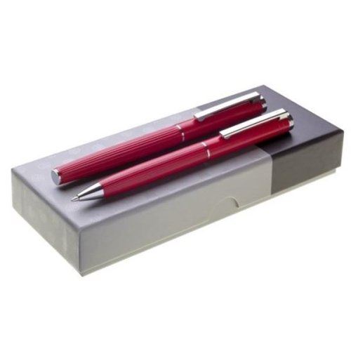 Darčeková sada s červenou perom a rollerom v darčekovej papierovej krabičke.