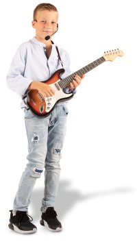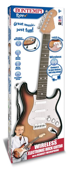 Štýlová elektrická gitara pre malých hudobníkov s bezdrôtovým pripojením. Dodáva sa s ramenným popruhom, mikrofónom a headsetom. Obsahuje funkciu „touch demo“ pre ľahké spustenie ukážkových skladieb. Ideálne pre detské hudobné vystúpenia aj domáce hranie. Atraktívny design a nové funkcie prinášajú zábavný spôsob, ako rozvíjať hudobný talent a rytmus.