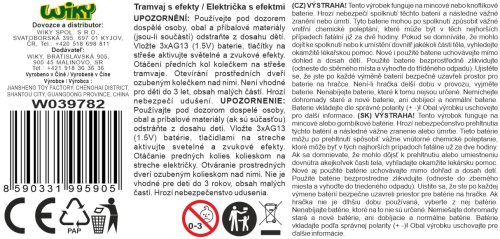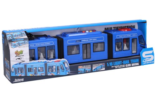 Električka s efektmi. Rozmery 42x6,5x9 cm. Voľné kolesá. Vydáva svetelné a zvukové efekty, aktivácia tlačidlami na streche. 3xAG13 (LR44 1.5V) batérie súčasťou. Otáčanie predných kolies kolieskom na streche. Otváranie prostredných dverí ozubeným kolieskom nad nimi.