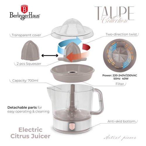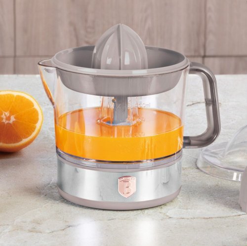 Štýlový elektrický lis citrusov v elegantnej nerezovo šdohnedej farbe je ideálnou voľbou pre rýchlu a pohodlnú prípravu čerstvej šťavy. Vďaka jednoduchému ovládaniu a jednoduchej údržbe sa stane obľúbeným pomocníkom vo vašej kuchyni.