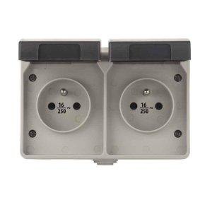 produkt: zásuvka dvojnásobná s ochrannými kolíkmi a viečkami s prepojením design: FRENCH typ: 250 V~/16 A max. farba: šedo-čierna spôsob montáže: na stenu krytia: IP44 prevedenie: 2 nás. vodeodolná …