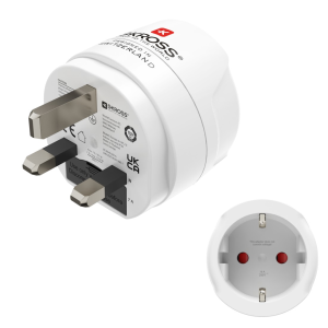 - kompaktný zásuvkový adaptér na pripojenie spotrebičov s európskou vidlicou do zásuvky britského typu - vhodné pre zásuvky typu G (Veľká Británia, Írsko, Malta, Cyprus, Saudská Arábia, SAE, Keňa, Indonézia, …