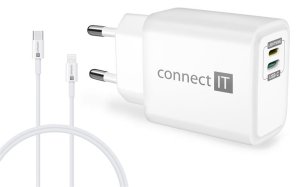 CONNECT IT DUPLEX Nabíjací adaptér 1xLightning + 1×USB-C, 20W, kábel 27W, BIELÝ