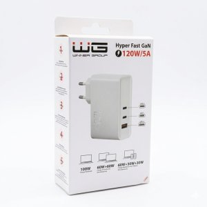 WG sieťová nabíjačka do 230V zásuvky pre rýchle a spoľahlivé nabíjanie vašich mobilných zariadení. Táto nabíjačka s max. výkonom 120 W dokáže nabíjať až tri zariadenia súčasne vr. notebookov.