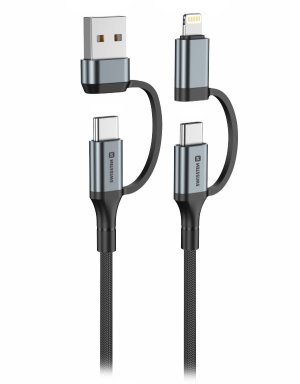 SWISSTEN 4 v 1 USB/USB-C na USB-C/Lightning 1,5 m čierny Univerzálny textilný kábel 4 v 1 na nabíjanie rôznych typov zariadení s podporou rýchleho nabíjania.