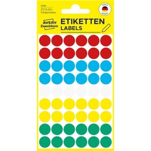 Okrúhle značkovacie etikety v mixe farieb, vhodné pre ručný popis Farba: mix farieb Priemer: 12 mm Počet etikiet na hárku: 54 ks Počet hárkov: 5 ks Počet etikiet v balení: 270 ks