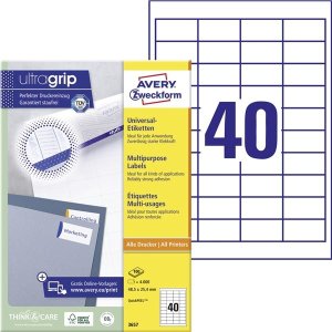 Biele samolepiace etikety ako pre laserové a atramentové tlačiarne, tak pre kopírky Formát: A4 Rozmer etikety: 48,5 x 25,4 mm Počet etikiet na hárku: 40 ks (s rámčekom) Balenie: 100 listov Celkom etikiet v balení: …