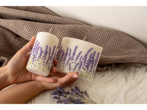 Sviečka v tvare elipsy s motívom levandule. Elegantný a upokojujúci motív levandule je ideálny na vytvorenie relaxačnej atmosféry. Jej rozmery sú 115x53x100mm.