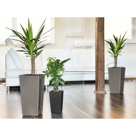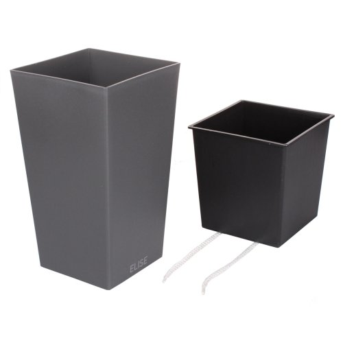 Štýlový dekoratívny kvetináč Elise Mat s matným povrchom je ideálnym doplnkom domov aj na záhradu. Hranatý kvetináč s vyberateľnou nádobou je vyrobený z pevného plastu, ktorý je odolný proti mrazu as UV stabilizátorom, takže ho bez obáv môžete nechať na záhrade cez zimu aj cez slnečné leto. Kvetináč má integrovaný skrutkovateľný prepad na odtok dažďovej vody. Model Elise Mat 15 má zabudovaný samozavlažovací systém s knôtmi. K modelom Elise Mat 20/25/30 je možné dokúpiť samozavlažovací systém Smart System Elise. Kvetináč má v každom rohu háčiky pre komfortné vytiahnutie vnútornej nádoby. Parametre: Elise Mat 15 Výška: 26 cm Dĺžka hornej hrany: 14,5 cm Výška priestoru na stávkovanie: 15 cm Elise Mat 20 Výška: 36,5 cm Dĺžka hornej hrany: 19 cm Výška priestoru na stávkovanie: 20 cm Elise Mat 25 Výška : 46,5 cm Dĺžka hornej hrany: 24 cm Výška priestoru na stávkovanie: 25 cm Elise Mat 30 Výška: 57,5 cm Dĺžka hornej hrany: 28,5 cm Výška priestoru na stávkovanie: 30 cm