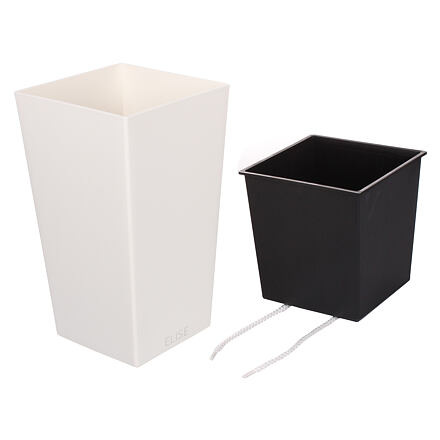 Štýlový dekoratívny kvetináč Elise Mat s matným povrchom je ideálnym doplnkom domov aj na záhradu. Hranatý kvetináč s vyberateľnou nádobou je vyrobený z pevného plastu, ktorý je odolný proti mrazu as UV stabilizátorom, takže ho bez obáv môžete nechať na záhrade cez zimu aj cez slnečné leto. Kvetináč má integrovaný skrutkovateľný prepad na odtok dažďovej vody. Model Elise Mat 15 má zabudovaný samozavlažovací systém s knôtmi. K modelom Elise Mat 20/25/30 je možné dokúpiť samozavlažovací systém Smart System Elise. Kvetináč má v každom rohu háčiky pre komfortné vytiahnutie vnútornej nádoby. Parametre: Elise Mat 15 Výška: 26 cm Dĺžka hornej hrany: 14,5 cm Výška priestoru na stávkovanie: 15 cm Elise Mat 20 Výška: 36,5 cm Dĺžka hornej hrany: 19 cm Výška priestoru na stávkovanie: 20 cm Elise Mat 25 Výška : 46,5 cm Dĺžka hornej hrany: 24 cm Výška priestoru na stávkovanie: 25 cm Elise Mat 30 Výška: 57,5 cm Dĺžka hornej hrany: 28,5 cm Výška priestoru na stávkovanie: 30 cm