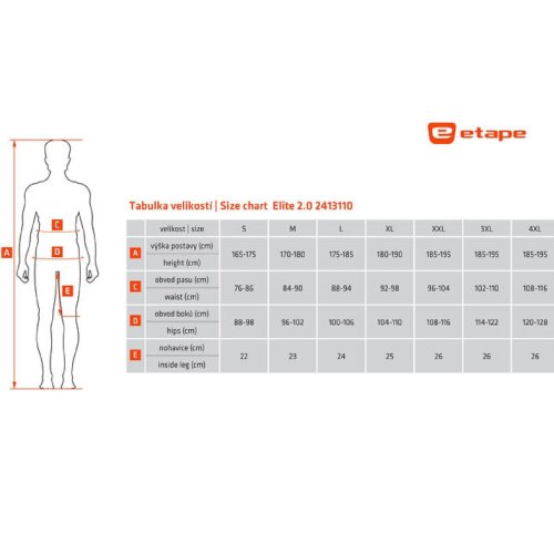 Elastické pánske šortky ETAPE Elite 2.0 ocení každý cyklista, či už na bicykli jazdí pravidelne alebo rekreačne. Tieto cyklistické krátke nohavice sú vyrobené z materiálu Fibra Pro™ - materiál s vynikajúcou kompresnou funkciou pre ešte lepšie športové výkony. Dokonale sa prispôsobí telu a nebráni pohybu. Vložka SOFT ponúka vďaka bezšvovej technológii vynikajúce pohodlie pri jazde na bicykli. - materiál Fibra Pro™ - protišmykové silikónové zakončenie nohavíc Fit+™ - reflexné bezpečnostné prvky - vložka Soft Man Veľkostná tabuľka v obrázkoch. Uvedené hodnoty sú iba orientačné a vhodná veľkosť sa môže líšiť podľa konkrétneho typu postavy.
