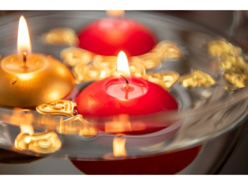 Súprava 4 červených plávajúcich sviečok Emocio v krabičke, ideálna pre romantickú atmosféru. Rozmery každej sviečky sú 40x40 mm.