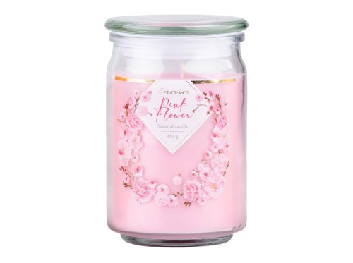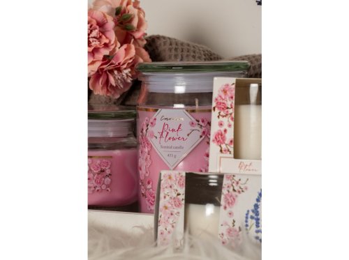 Sklenená sviečka v ružovej farbe s kvetinovým motívom, ktorá bude krásnym doplnkom vášho interiéru. Jej rozmery sú 93x142 mm.