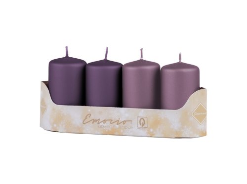 Súprava štyroch valcových sviečok Emocio o rozmere 40×75 mm v elegantnom metalicky matnom prevedení. Farebná kombinácia tmavo fialovej a svetlo fialovej je dodávaná v mixe, jednotlivé sviečky sa môžu líšiť odtieňom.