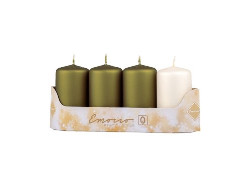 Súprava štyroch valcových sviečok Emocio o rozmere 40×75 mm v elegantnom metalicky matnom prevedení. Farebná kombinácia zelenej a krémovej je dodávaná v mixe, jednotlivé sviečky sa môžu líšiť odtieňom.