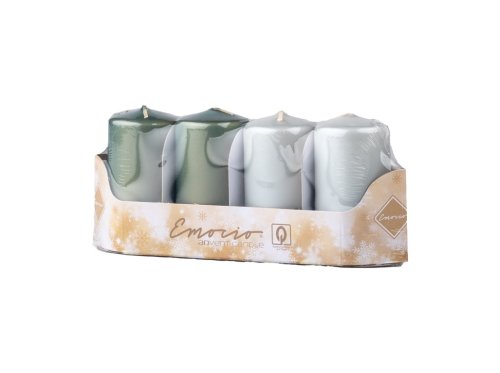 Sada 4 kusov valcových sviečok Emocio o rozmere 40×75 mm v metalickom matnom zelenom prevedení. Farebné odtiene sú dodávané v mixe, jednotlivé sviečky sa môžu mierne líšiť tónom.