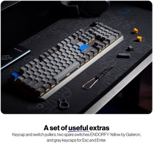V krabici nájdete kompletnú sadu príslušenstva: bezdrôtový USB prijímač, nástroje na snímanie klávesov a spínačov, dva náhradné spínače Endorfy Yellow a minimalistické šedé klávesy Esc a Enter pre doladenie vzhľadu.