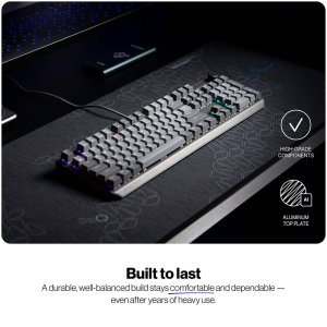 Klávesnica je vyrobená z prémiových materiálov a vystužená pevnou hliníkovou hornou doskou , vďaka čomu ponúka robustný a vyvážený pocit pri používaní. Tri vrstvy akustickej peny PORON, EPDM a IXPE minimalizujú ozvenu a eliminujú dutý zvuk pri písaní pre čistý a uspokojivý akustický zážitok.