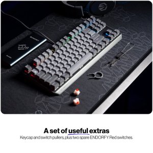 V balení nájdete nástroj na sňatie klávesov, nástroj na výmenu spínačov, dva náhradné spínače Endorfy Red a odpojiteľný USB-C kábel s dĺžkou 1,8 m pre flexibilné pripojenie.