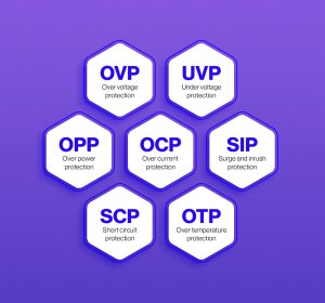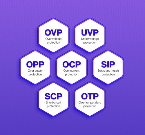 Zdroj obsahuje kompletnú sadu elektrických a tepelných ochrán vrátane ochrany proti preťaženiu (OVP), podpätiu (UVP), nadprúdu (OCP), skratu (SCP), preťaženiu (OPP), zapínaciemu prúdu (SIP) a prehriatiu (OTP). Tieto prvky zaisťujú maximálnu bezpečnosť pripojených komponentov.