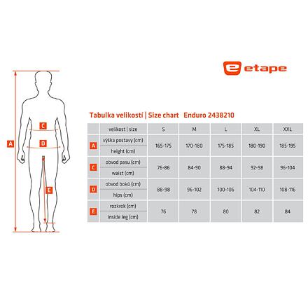 Športové nohavice ETAPE Enduro sú ideálnou voľbou pre mužov, ktorí hľadajú pohodlné a funkčné nohavice na cyklistiku, behanie alebo len bežné nosenie. Nohavice sú vyrobené z ľahkého a elastického materiálu X6. Materiály z radu X sú veľmi priedušné a zároveň odolné proti oderu a opotrebovaniu. Ideálne teda kombinujú požiadavky na oblečenie na šport a voľný čas. Nohavice sa zapínajú na dva cvočky so zipsom a dva pásiky na suchý zips slúžia pre pohodlné stiahnutie. Nohavice majú 2 vrecká na zips, pútko na rukavice a okuliare, ventilačné otvory pod kolenami, elastické panely pri členkoch pre pohodlné obliekanie a sú bez vnútornej cyklistickej vložky. - priedušný a elastický materiál X6 - elastický panel vzadu pre väčšie pohodlie pri jazde na bicykli - pásky pre pohodlné stiahnutie v páse - 2 vrecká na zips - pútko na rukavice a okuliare - anatomické tvarovanie kolien - možnosť použitia chrániča kolien - ventilačné otvory pod kolenami - elastické panely u členkov pre pohodlné oblečenie vložkou Veľkostná tabuľka v obrázkoch. Uvedené hodnoty sú iba orientačné a vhodná veľkosť sa môže líšiť podľa konkrétneho typu postavy.