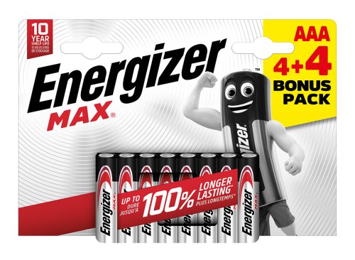 ENERGIZER MAX sú kvalitné alkalické batérie s extra výkonom pre prístroje s každodenným použitím. Vydržia výrazne dlhšie ako zinkochloridové batérie a než bežné alkalické batérie. Technológia PowerSeal garantuje, že batérie nevytečú do prístroja až 2 roky po ich úplnom vybití. Skladovateľnosť batérií je 10 rokov. Ideálne do diaľkových ovládačov, svietidiel a hračiek.
