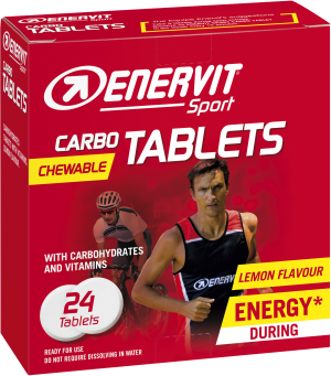 Energetické tablety Enervit Carbo Tablets (predtým Enervit GT Sport) sú pripravené tak, aby ste ich mohli mať vždy pri sebe na okamžité použitie. Majú vysoký obsah viacerých druhov sacharidov pre rýchle zažehnanie nastupujúcej únavy aj pre priebežné doplňovanie energie. Účinky energetických tabliet Energetické tablety pre okamžité doplnenie rýchlo vstrebateľnej energie (maltodextrín, dextróza) a potlačenie únavy z nedostatku energie pri športe. Fruktóza zaistí priebežné a postupné doplňovanie energie. Doplnené o vitamíny skupiny B a sodík. Vitamíny B (B1, B2, B3 a B5) prispievajú k zníženiu miery únavy a vyčerpania ak správnemu energetickému metabolizmu. Jednoduchá manipulácia počas výkonu, sú ľahko rozpustné v ústach. Prednosť Nezaberú veľa miesta, pri športe neprekážajú, ale zato odvedú výbornú službu doplnením energie aj protikŕčových minerálov. Odporúčané dávkovanie: Kedy a ako použiť Počas námahy je možné konzumovať od 6 do 14 kusov energetických tabliet, v závislosti od intenzity a dĺžky trvania športového výkonu. Tabletu vždy dôkladne rozhryzte a potom zapite nápojom. Energetické tablety obsahujú protikŕčové minerálne látky. Sú určené na priamo konzumáciu. Doba nástupu účinku je okamžitá, doba účinku 1 tablety je 20 minút. Tabuľka nutričných hodnôt: