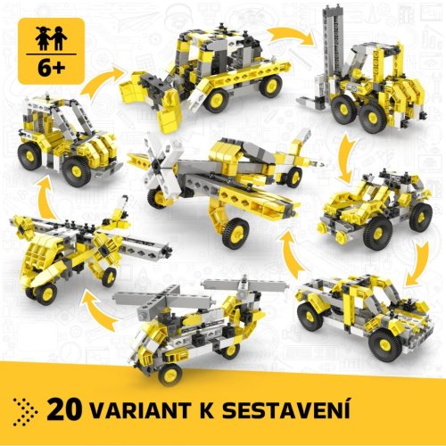 Stavebnica Engino Creative Builder 20 modelov je určená deťom od 6 rokov a ponúka široké možnosti tvorenia vďaka 20 rôznym variantom modelov, ktoré je možné zostaviť z jednej sady. Súprava obsahuje dieliky v kombinácii žltej, šedej, čiernej a bielej farby, ktoré umožňujú zostaviť rôzne stroje a vozidlá, ako sú autá, lietadlá, vrtuľníky či vysokozdvižný vozík. Vďaka variabilnému systému je možné modely ľahko prestavovať a rozvíjať tak manuálnu zručnosť a kreativitu detí.