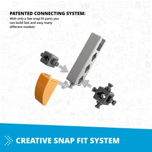 možnosť zostaviť 4 modely, stavebnica umožňuje: 1. level zostavenia modelu, 2. level vymaľovania papierových dielov, 3. level experimentovania, 4. level učenia sa, aplikácia Engino kidCAD zobrazujúca 3D model