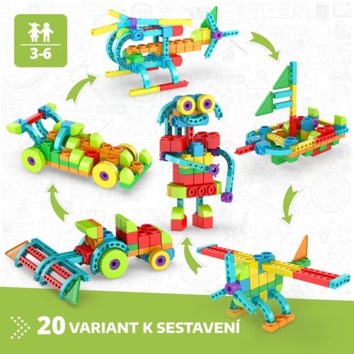 V rámci stavebnice je možné zostaviť až 20 rôznych variantov modelov podľa návodu a mobilnej aplikácie Engino kidCAD®. Táto interaktívna aplikácia ponúka 3D zobrazenie modelov, ktoré je možné ľubovoľne otáčať, prezerať a upravovať, čo prispieva k lepšiemu pochopeniu priestorových vzťahov a podporuje kreativitu detí. Modely sú farebné a hravé, napríklad autíčko s výraznými žltými kolesami, vrtuľník s modro-žltými prvkami či postavičky s veselými tvárami a rôznymi tvarmi. Vďaka kombinácii klasických kociek s oblými dielmi je možné vytvárať aj zložitejšie štruktúry a pohyblivé časti.