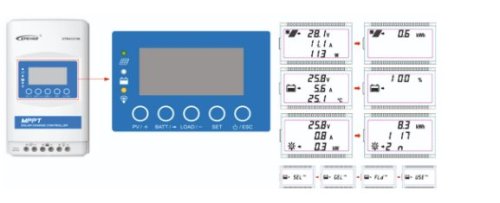 Priamo v MPPT regulátore je integrovaný multifunkčný displej pre ľahký monitoring systému a prípadné nastavenie prevádzkových parametrov vr. kontrolných LED diód. Cez displej je možné teda nastaviť všetko mimo užívateľských hodnôt batérie. Tieto hodnoty sa nastavujú cez príslušenstvo viď nižšie.