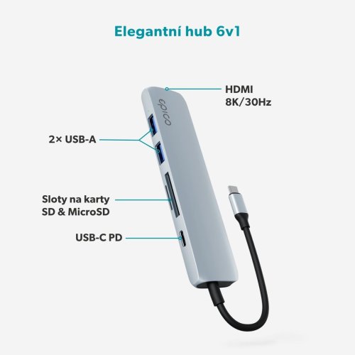 Epico 6in1 Aluminium Hub prináša elegantné riešenie pre každodennú prácu aj multimediálne využitie. Vďaka šiestim základným portom – HDMI, USB-C Power Delivery, dvom USB-A a slotom na SD aj MicroSD karty – získate spoľahlivé pripojenie pre všetky svoje zariadenia. HDMI port podporuje rozlíšenie až 8K/30Hz alebo 4K/120Hz, takže využijete plný potenciál monitorov s vysokým rozlíšením. Hub navyše prostredníctvom HDMI portu zaisťuje precízne podanie dynamického obrazu a zvuku vďaka technológii Dynamic HDR+ s až 12-bitovou farebnou hĺbkou a multikanálovým zvukom, vrátane Dolby Atmos a DTS:X.