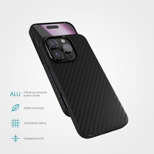 Kryt na telefón, pre Apple iPhone 16 Pro, kompatibilný s MagSafe, materiál aramidové vlákno, hliníkový rámček okolo objektívov, farba čierna.