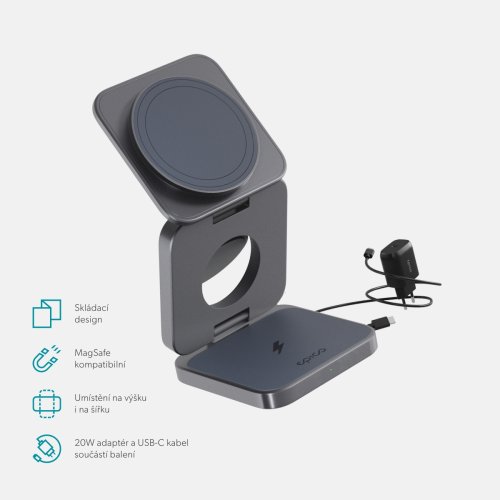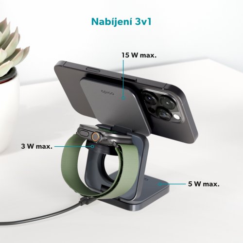 Kompaktná cestovná nabíjačka pre všetky vaše zariadenia Kompatibilita s MagSafe a Qi2: Bezpečné magnetické pripojenie pre pohodlné bezdrôtové nabíjanie.15W bezdrôtový výstup: Poskytuje až 15W bezdrôtové nabíjanie pre kompatibilné smartfóny a 7,5W pre iPhony. 3v1 nabíjanie: Nabíjajte súčasne smartfón, Apple Watch (3W) aj AirPods (5W). Skladný dizajn: V zloženom stave nezaberie skoro žiadne miesto? perfektné na cesty aj doma. Flexibilné umiestnenie: Nastavte si obrazovku do ideálneho uhla? na výšku alebo na šírku ? s režimom StandBy pre zobrazenie času a oznámenia. Protišmyková silikónová základňa: Udrží nabíjačku pevne na mieste. LED indikátor: Majte prehľad o stave nabíjania na prvý pohľad.