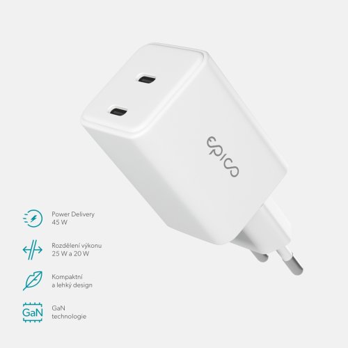Rýchle nabíjanie 45 W: Ideálne pre rýchle a spoľahlivé nabíjanie telefónov, tabletov, menších notebookov a ďalších zariadení. Dva USB-C porty: Dva USB-C porty s technológiou Power Delivery umožňujú nabíjať dve zariadenia naraz. Technológia GaN: Menšie, chladnejšie a úspornejšie pre pohodlnejšie nabíjanie. Ideálne na cesty: Vďaka ľahkému a kompaktnému dizajnu nabíjačku ľahko vezmete kamkoľvek so sebou. Vstavané bezpečnostné prvky: Spoľahlivé nabíjanie s ochranou proti skratu, prepätiu, preťaženiu a prehriatiu.