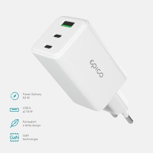 Nabíjačka do siete - s podporou rýchleho nabíjania, celkový výkon 65 W (1x USB-C až 65 W, 1x USB-C až 20 W, 1x USB-A až 18 W), technológia Power Delivery, technológia GaN.