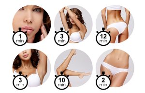 Oblasť nad hornou perou: 1 min. Ruky: 3 min. Chrbát: 12 min. Podpazušie: 3 min. Nohy: 10 min. Oblasť bikín: 2 min.