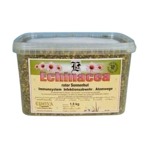 Echinacea - Echinacea purpurová. Výborný preventívny prostriedok proti respiračným ochoreniam. Echinacea je prírodné antibiotikum a prostriedok proti infekciám, vírusom a baktériám v organizme. Obsahuje niekoľko chemických látok, ktoré hrajú veľkú úlohu v liečebných účinkoch rastliny, medzi ne patria polysacharidy, glykoproteíny, alkamidy, esenciálne oleje a flavonoidy. Je schopná aktivovať biele krvinky, ktoré pohlcujú pôvodcu infekcie priamo v organizme zvieraťa, a začnú produkovať protilátky. Vďaka tomu vykazuje značnú antibiotickú aktivitu a to nielen proti baktériám, ale aj proti vírusom. Echinacea sa používa na prevenciu a liečbu bakteriálnych a vírusových ochorení a na celkové zvýšenie obranyschopnosti organizmu. Ďalej je vhodná na liečbu kataru dýchacích ciest, chrípky, zápalov dutín, či obyčajného prechladnutia, na zápaly močového mechúra, lymfatických uzlín av neposlednom rade pri kožných problémoch a hojení rán. Pomáha pohlcovať voľné radikály vzniknuté slnečným žiarením a tým sa veľkou mierou podieľa na ochrane kože. Odporúča sa do stajní, kde je predpoklad šírenia vírusového ochorenia. Vhodné obdobie pre preventívne podávanie echinacea je najmä jar a jeseň, kedy býva imunitný systém koní oslabený. Zloženie: 100 g obsahuje cca: hrubá vláknina 24,10%, hrubý proteín 15,6%, popolovina 6,5%, tuk 1,5%. Odporúčaná kŕmna dávka 25 g denne pre kone, 10-15 g denne pony a malé plemená.