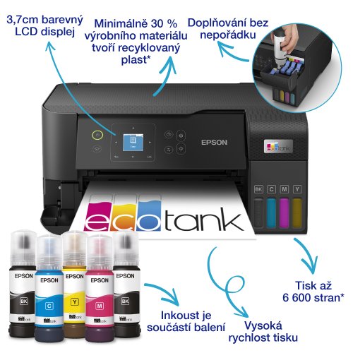 Rozhranie: USB, Wi-Fi, Wi-Fi Direct WLAN zabezpečenie: WEP 64 Bit, WEP 128 Bit, WPA PSK (TKIP), WPA2 PSK (AES), WPA3-SAE (AES) Tlač z mobilných zariadení a tlač do cloudu: Epson Connect (Email Print, Remote Print Driver) Napájanie: 220 V, 240 V Obsah dodávky: 4 samostatné 65ml fľaštičky s atramentom (čierna, azúrová, žltá a purpurová) a 1 náhradná fľaštička s čiernym atramentom , Hlavné zariadenie, napájací kábel, Návod na inštaláciu, Záručný dokument Farba: Čierna