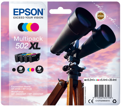 Technológia Obsah: 1 x 9,2 ml Čierna, 1 x 6,4 ml Azúrová, 1 x 6,4 ml Žltá, 1 x 6,4 ml Purpurová Výťažnosť strán: 550 s (čierna), 470 s (farby) Kapacita: Vysoká Skratka: 502XL Symbol: Ďalekohľad Veľkosť: XL