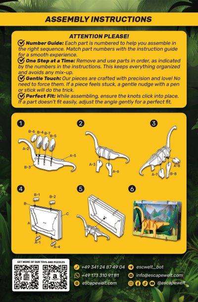3D puzzle Brontosaurus je pre deti zábavné a zároveň výzvou na rozvoj ich priestorovej predstavivosti a logického myslenia. Rozvíja sa zároveň aj jemná motorika. Toto drevené 3D puzzle obsahuje 19 dielikov, ktoré musia byť správne zložené dohromady, aby vytvorili podobu Brontosaura, obľúbeného dinosaura. Jednotlivé diely z drevenej preglejky jednoducho vytlačíte a podľa priloženého návodu krok za krokom skladáte rôzne modely - drevené hračky. Puzzle nemusíte lepiť lepidlom, potom ich je možné kedykoľvek rozložiť a znovu zložiť. Odporúčame si preto ponechať návod na stavbu. Farebné drevené 3D puzzle sú opatrené kvalitnou potlačou. Tieto drevené hračky sú určené deťom od 8 rokov a spĺňajú všetky normy EÚ. Upozornenie: Nie je vhodné pre deti do 3 rokov, pretože obsahuje malé súčasti – hrozí nebezpečenstvo udusenia. Baliaci materiál nie je hrač ka. Hlavné vlastnosti: prírodné drevené 3D puzzle rozvíja jemnú motoriku a predstavivosť vhodné od 8 rokov jednoduchá obtiažnosť