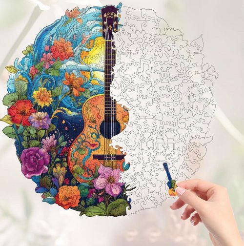 Puzzle s obrázkom gitary v kvetoch je unikátne drevené skladacie puzzle, ktoré spája kvalitné remeselné spracovanie s ekologicky zodpovedným prístupom. Je vyrobené z 5 mm FSC® certifikovaného dreva, ktoré zaručuje, že pri výrobe boli dodržané najvyššie štandardy v správe lesov, čo prispieva k udržateľnosti a ochrane biodiverzity. Každý z jedinečných 200 dielikov skladačky je precízne vyrezaný laserom, čo zaisťuje dokonalú presnosť a hladkosť hrán, čím uľahčuje skladanie aj manipuláciu s dielikmi. Farebný a detailný obraz je reprodukovaný pomocou modernej technológie UV digitálnej tlače, čo prináša realistické a živé farby do každého kúsku skladačky. Toto puzzle je výzva pre všetkých milovníkov skladačiek, ktorým poskytne hodiny zábavy. Je tiež dobrou príležitosťou, ako dať dohromady celú rodinu a priateľov. Zložený obrázok môže slúžiť ako krásny a dekoratívny doplnok pre váš priestor. Balenie obsahuje: 200 dielikov puzzle, úložný box, fóliu na podlepenie, samolepky na montáž na stenu, návod. Hlavné vlastnosti: obsahuje 200 jedinečných dielikov UV digitálna potlač prémiová kvalita puzzle 100% FSC® drevodieliky precízne vyrezané laserom rozvíja logické myslenie a motorikou súčasťou balenia fólie na podlepenie puzzle unikátne tvary a design