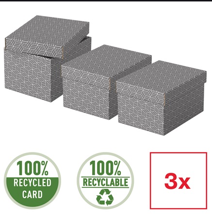 Sada 3 malých dekoratívnych lepenkových úložných boxov Esselte Home na ukladanie drobností alebo aj na darčeky. Rýchle a ľahké zostavenie.