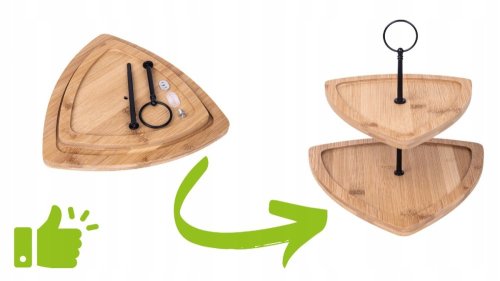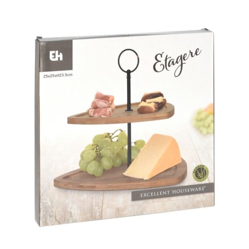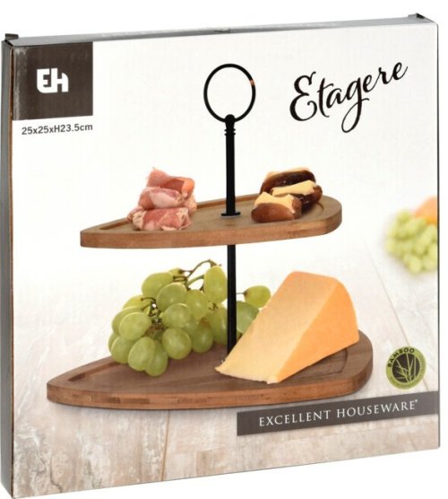 Drevený etažér umožňuje servírovanie a prezentáciu sladkých aj slaných pochúťok až na dvoch poschodiach, čo Vám ušetrí miesto na jedálenskom stole. Veľmi často sa používa etažér na pečivo, ale môžete na ňom servírovať ovocie, jednohubky, predjedlá, sušienky, makrónky i zákusky. Etažér je vyrobený z bambusového dreva, ktoré je odolné a zároveň ekologické. Vďaka bambusu je etažér ľahký a ľahko prenosný, takže ho môžete ľahko premiestniť z jedného miesta na druhé.