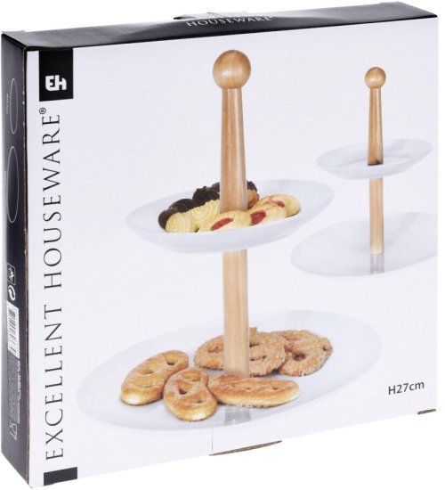 • dvojposchodový etažér na potraviny - často využívaný ako stojan na vianočné pečivo - vhodný nielen na pečivo, tortičky, zákusky, muffiny, makrónky, ale aj ovocie alebo slané chuťovky - podnosy z lesklého bieleho porcelánu - drevená konštrukčná tyč v prírodnej farbe - ľahké prenášanie vďaka hornému madlu- rozmery spodného podnosu: 24 cm- rozmery horného podnosu: 16,5 cm- výška: 27 cm- farba: biela lesklá / drevo- značka: Excellent Houseware