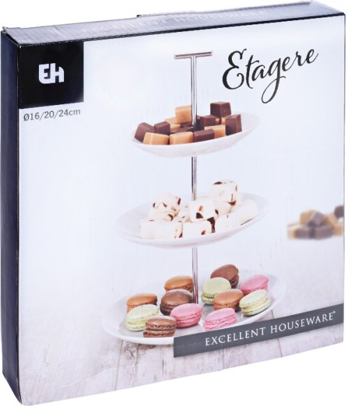 • trojposchodový etažér pre servírovanie či vystavenie rôznych pokrmov - najčastejšie využívaný ako stojan na vianočné pečivo - vhodný nielen na pečivo, tortičky, zákusky, muffiny, makrónky, ale aj ovocie alebo slané chuťovky - poctivé prevedenie z čisto bieleho lesklého porcelánu so stredovou oporou z nerez - premyslená stredová os je v hornom bode zakončená malou rukoväťou pre pohodlné prenášanie stojana- priemery tanierov: 24, 20 a 16 cm- celková výška: 33 cm