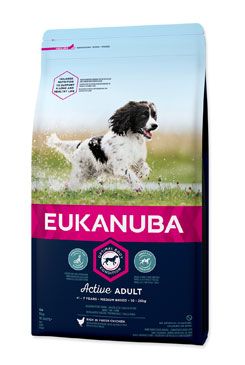 Nová EUKANUBA vylepšená receptúra so zameraním na konkrétnu fázu života – pre stredne veľkých aktívnych dospelých psov od 1 roku do 7 rokov – poskytuje na mieru upravenú výživu pre podporu štíhlych svalov a vyvážený príjem energie, ktoré zaistia optimálny telesný stav vášho dospelého psa. Naša jedinečná na mieru upravená receptúra pre veľkých dospelých psov obsahuje zmes vlákniny, prebiotiká FOS a repnej dužiny pre podporu zdravého zažívania, juku, ktorá pomáha znížiť zápach zo stolice, prirodzený zdroj mastných kyselín omega-6 a omega-3 pre zdravú kožu a srsť, L-karnitín, ktorý pomáha s vitamínom systému. Naše unikátne granule v tvare šesťuholníka s prídavkom DentaDefense taktiež pomáhajú s udržiavaním čistých a zdravých zubov. Pokročilá výživa pre stredne veľké dospelé psy so zameraním na podporu optimálneho telesného stavu a celoživotnú pohodu.