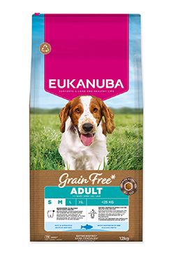 Toto suché krmivo EUKANUBA Grain Free* je špeciálne vyvinuté pre dospelých psov malých a stredne veľkých plemien od 1 roku do 7 rokov. Zloženie s nízkym obsahom alergénov a bohatým obsahom morských rýb je starostlivo navrhnuté pre psov s citlivosťou na obilniny a podporuje ich jedinečné nutričné potreby. Zloženie bez kuracieho mäsa ponúka plnohodnotnú výživu s alternatívnymi zdrojmi sacharidov, vrátane hrachu a bezlepkových sladkých zemiakov*, ktoré poskytujú prírodnú vlákninu, základné vitamíny a antioxidanty. Krmivo je nabité morskými rybami a dodáva vášmu psovi kvalitné živočíšne bielkoviny nevyhnutné na budovanie a udržanie silných, štíhlych svalov. Na ďalšiu podporu zdravého trávenia obsahuje krmivo prebiotické fruktooligosacharidy a repnú dužinu. Prírodné zdroje omega-6 a omega-3 mastných kyselín navyše podporujú zdravú kožu a lesklú srsť. Jedinečný tvar granúl v kombinácii s technológiou DentaDefense pomáha udržiavať zuby čisté a zdravé. Pridané antioxidanty a vitamíny posilňujú imunitný systém. Toto 100% kompletné a vyvážené krmivo poskytuje pokročilú výživu pre dospelých psov malých a stredne veľkých plemien, podporuje optimálnu telesnú kondíciu, celoživotné zdravie a celkovú pohodu. Krmivo EUKANUBA poskytuje kvalitnú výživu prispôsobenú výživovým potrebám vášho psa.